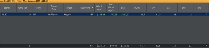01-05.04.2015 Первая неделя апреля прошла удачно, БР потихоньку возвращается и появляются новые амбиции. Решил откорректировать цель в 500 турниров на апрель и заменить ее на получение статуса Silver для этого нужно отыграть порядка 600 турниров. Отыграл пару МТТ в обоих до ИТМ не дотянул. Основная дисциплина радует : 139 турниров 9 макс с нокаутами с рои 15,9%