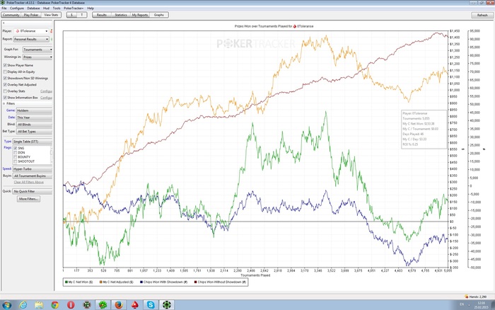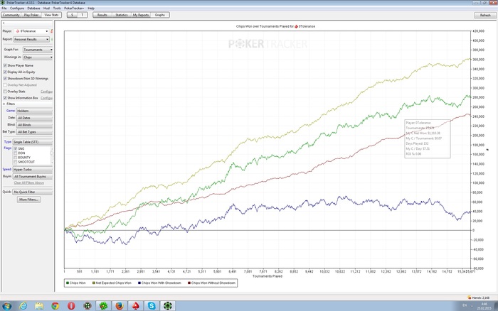 Dendrover @ 25.2.2015 я не мастер. но ты графики непрально вывел. тебе надо снять галочку с аллин эквити - которая отвечает за ЕВ по фишкам - и переставить ее на оверлай нет аджастед - которая отвечает за ЕВ по деньгам. Там будет совсем другой резалт по ев, и он будет хуже, соотв такого недобора не будет. А вообще словить 100би недобора в гиперах это изи.