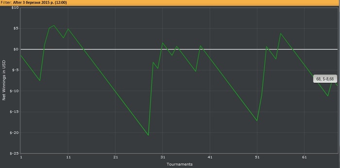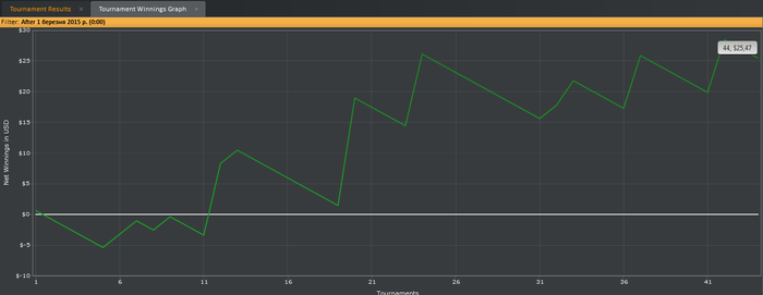 Вчера только доиграл очередную пачку турниров и ... пропал интернет. Появился только сегодня утром. Сыграл мало и в небольшой минус: