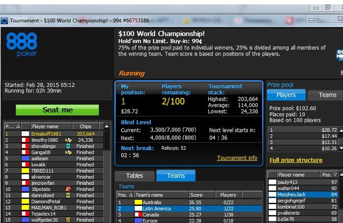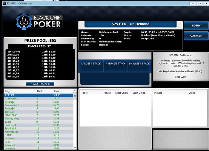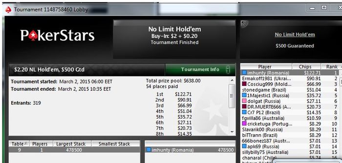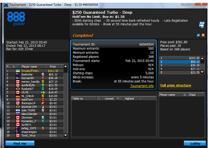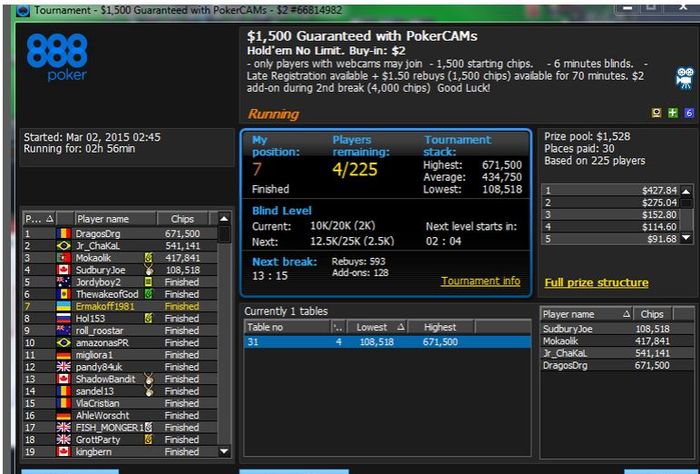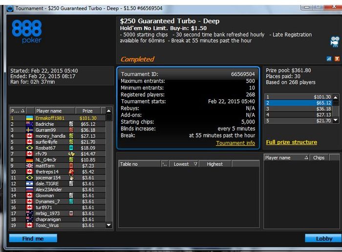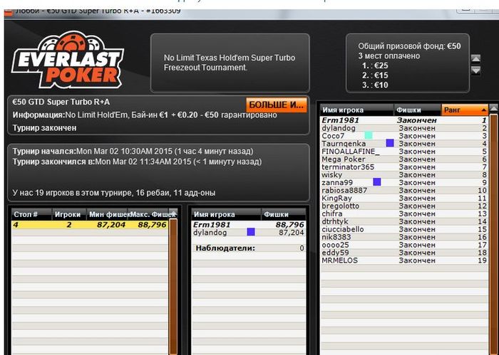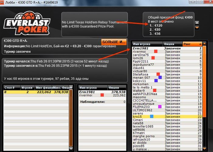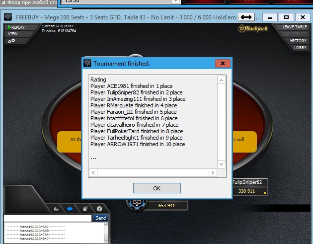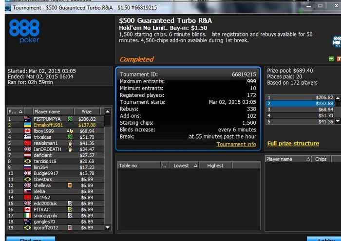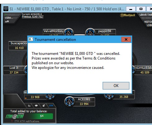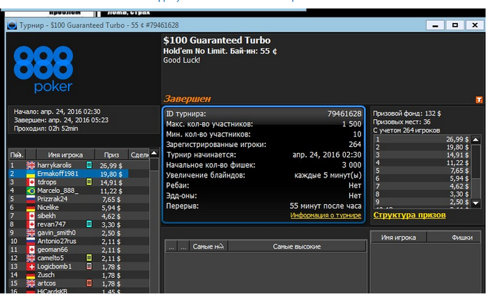 позавчера(22,04) сел играть в турик за 1уе с ре-эентри..гарант 1000 и как всегда 12 лвл реги поздней. откатали мы до топ 41 и тут софт решил залагать..после долгих попыток реконнекта,хост объявил :