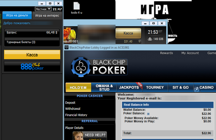 ПОДЪЕМ С КОЛЕН Привет тем ,кто это прочитает.В чем я сильно сомневаюсь,что этот бложик вызовет какой-то интерес у кого-то.Пишу для себя,для самоорганизации,может быть для критики или предложений или для простого общения Меня зовут Андрей,.можно Ермак.на этом форуме давно ,но особо никем не замечен.Многие меня могут знать по другому покерному сообществу После долгого перерыва попытаюсь вернуться и поднять БР и вернуться в игру. Итак,бр-лы таковы(смешно называть их так,но все же) : 888покер(Ermakoff1981) : 27уе BlackChipPoker(ACE1981) : 20уе ПС(Ermakoff1981) : 30уе