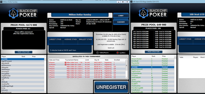 и вот ,наступил вчерашний день..скажу так было всего 4-5 столов..причем 3 из них закончились очень быстро..да я вообщ уже не планировал вчера садиться после 5ч хождения с женой по выставке.но тут промелькнула в голове мысль о вчерашнем поиске.время есть-поищу усерднее. если не найду-все прошло без меня и так. найду-хоть буду знать когда и что это. открываю америкосов и у меня всплывает стол с надписью турнир начнется через 58сек.стек стартовый вроде!!!ОООоооо вот это совпадение. оказался это последний сат по 66уе на турик в Million Dollar Saunday би 500. тыкал-тыкал и натыкал
