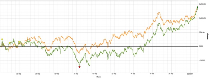 задротомгеймером то и дело натыкался на информацию, что многие прошники уходили в покер и зарабатывали там хорошие деньги, одной из основных же причин стал Voland известный тут , как mewezaso, так как был одним из людей которых я знал и зарабатывал в покере не плохие деньги, он и помог освоиться в покере и учил играть. Началось это все чуть больше года назад, начинал играть с нл2, нынче играю нл50 ФР зум и обычные столы(в последнее время только зум).График за нл50 зум:
