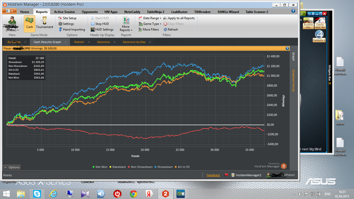 Из своих лучших достижений считаю выигрыш турнира на PokerStars с байином 33$ занял первое место , в финале закрыл глаза и проколлил 3бет с А9 , против 44 , Туз приходит на терне и я побеждаю, радости было полные штаны, 7000к $ упали в карман ,купил машину, какую то часть проиграл, далее через пол года еще один турнир занял 6 место +1800$. В данный момент мой рабочий лимит 0.5/0.10$ играю его уже 3 месяца , сейчас кину график