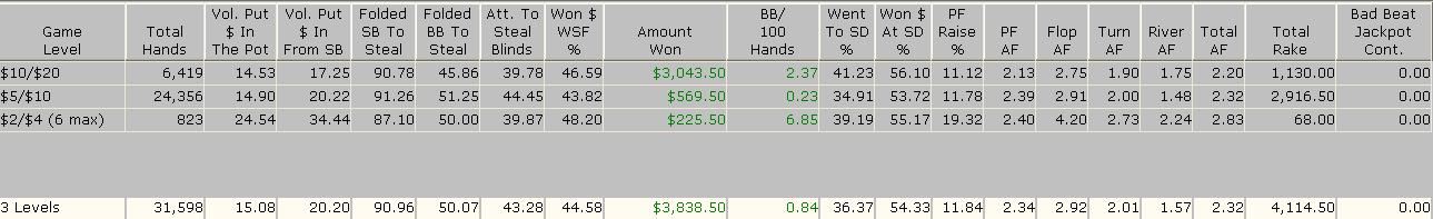 Всю 1000 рук, что я тут сыграл, я играл против очень слабых и пассивных оппонентов и с учетом того, что я не занимался никаким селекшеном и вообще не имел никакой предварительной информации о тех игроках, против которых я играю (просто садился на любой свободной стол), у меня сложилось впечатление, что такая мягкая игра является нормой для этого лимита.