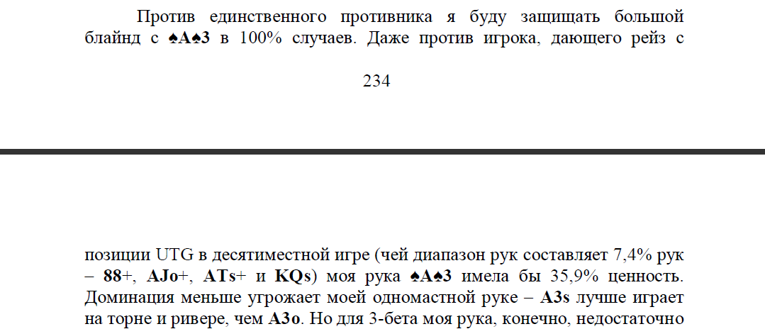 | Сообщение от marimba (http://forum.cgm.ru/limit-holdem_srednih_i_vysokih_stavok//kolodets/images/viewpost.gif) Feruell, вот выдержка из Стокса. Вложение 111884 Против указанного диапазона 88+, AJo+, ATs+, KQs доля As3s не 35,9%, а 32,4%. Действительно ли стоит защищать ББ с одномастным слабым тузом при рейзе из UTG в 10макс игре? |