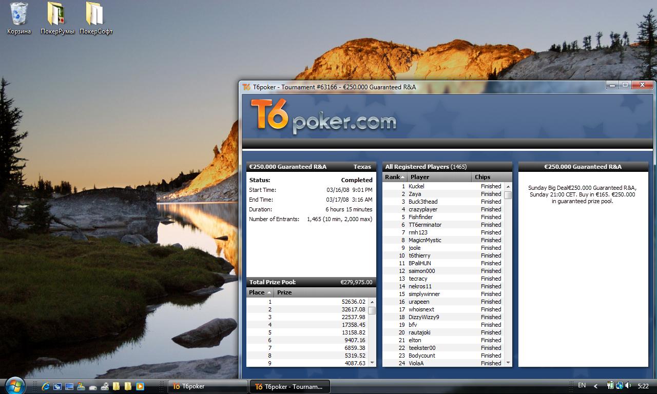 Они редко пишут на данном форуме, поэтому вряд ли вам их имена что-то скажут. Народ растет. На прошлой неделе, например, они выиграли 2 турнира, 1-й - по 100 фризаут, 2-й - 20 с ребаями, за 1 место в каждом больше 5К было, в финале одного из них мой ученик (с небольшими коментариями с моей стороны, но все решения принимал он сам) обыграл Макса Каца, что вдвойне приятно 8-) Также 2 из них выиграли сателиты на Гранд турнамент на прошлой неделе. |